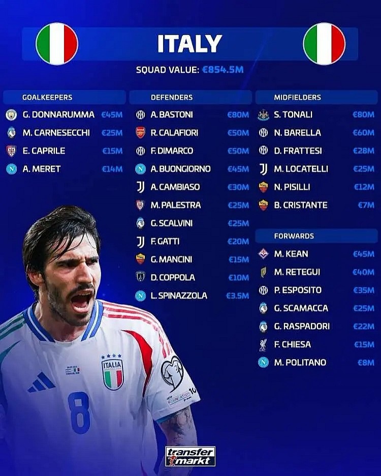 意大利队的身价超过了德国(7.74亿欧元)、荷兰(7.66亿欧元)、比利时(5.24亿欧元)和挪威(5.04亿欧元),实战成绩之差令人咋舌。