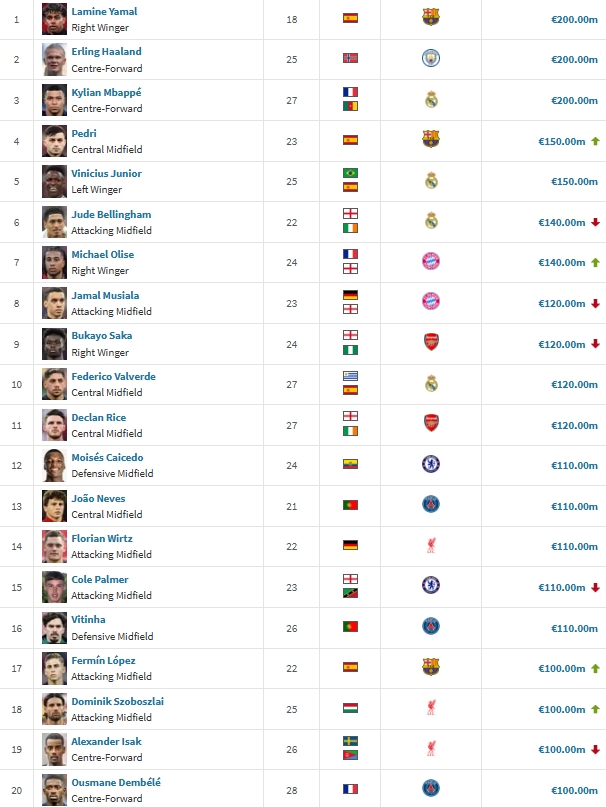 当年《都灵体育报》创立金童奖,原本是为了激励意大利本土球员,没想到近15年来仅有1名意大利球员(巴洛特利)加冕。在2025年度候选名单中,意大利只有2人入围(莱奥尼&皮奥·埃斯波西托),远低于法国和英格兰(5人)。在德国转会市场公布的最新球员身价榜中,亿元先生多达20人,意大利竟无一人上榜。